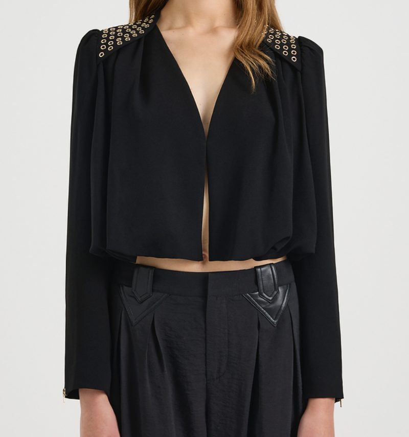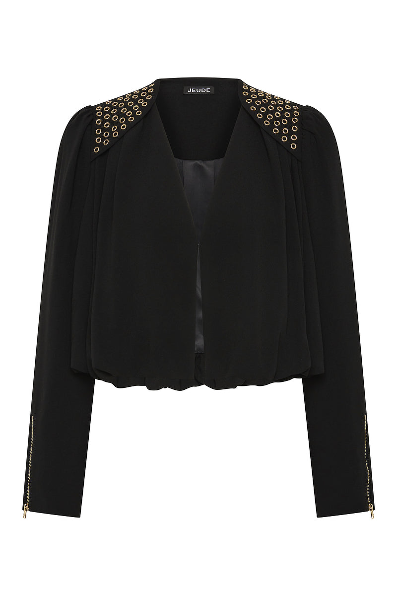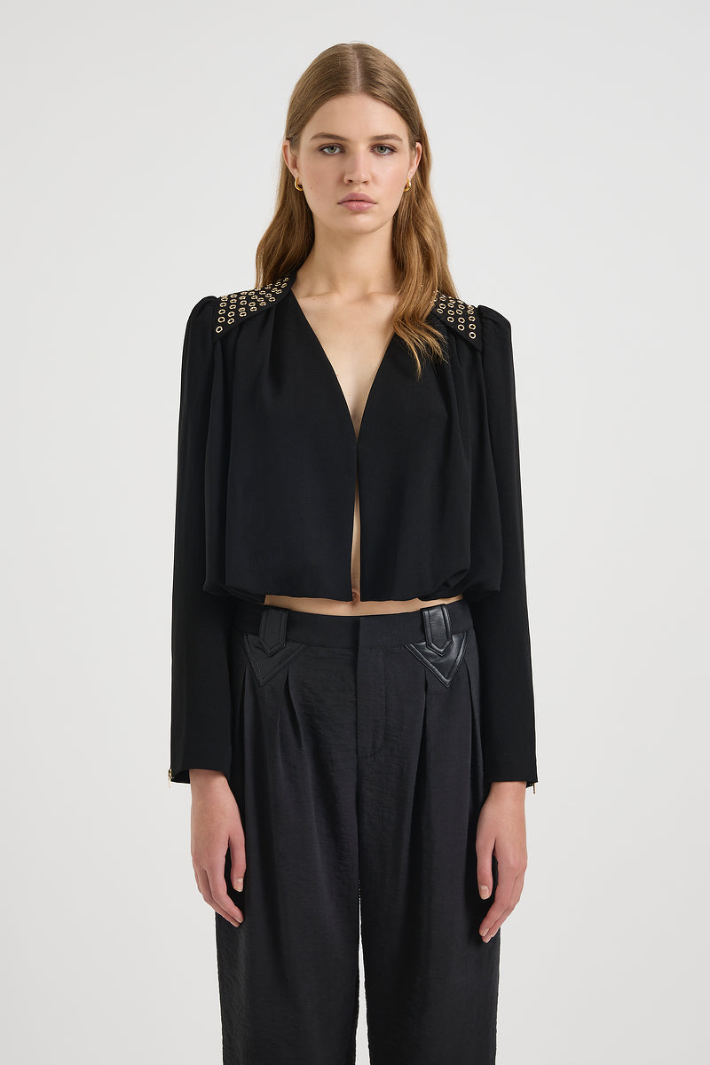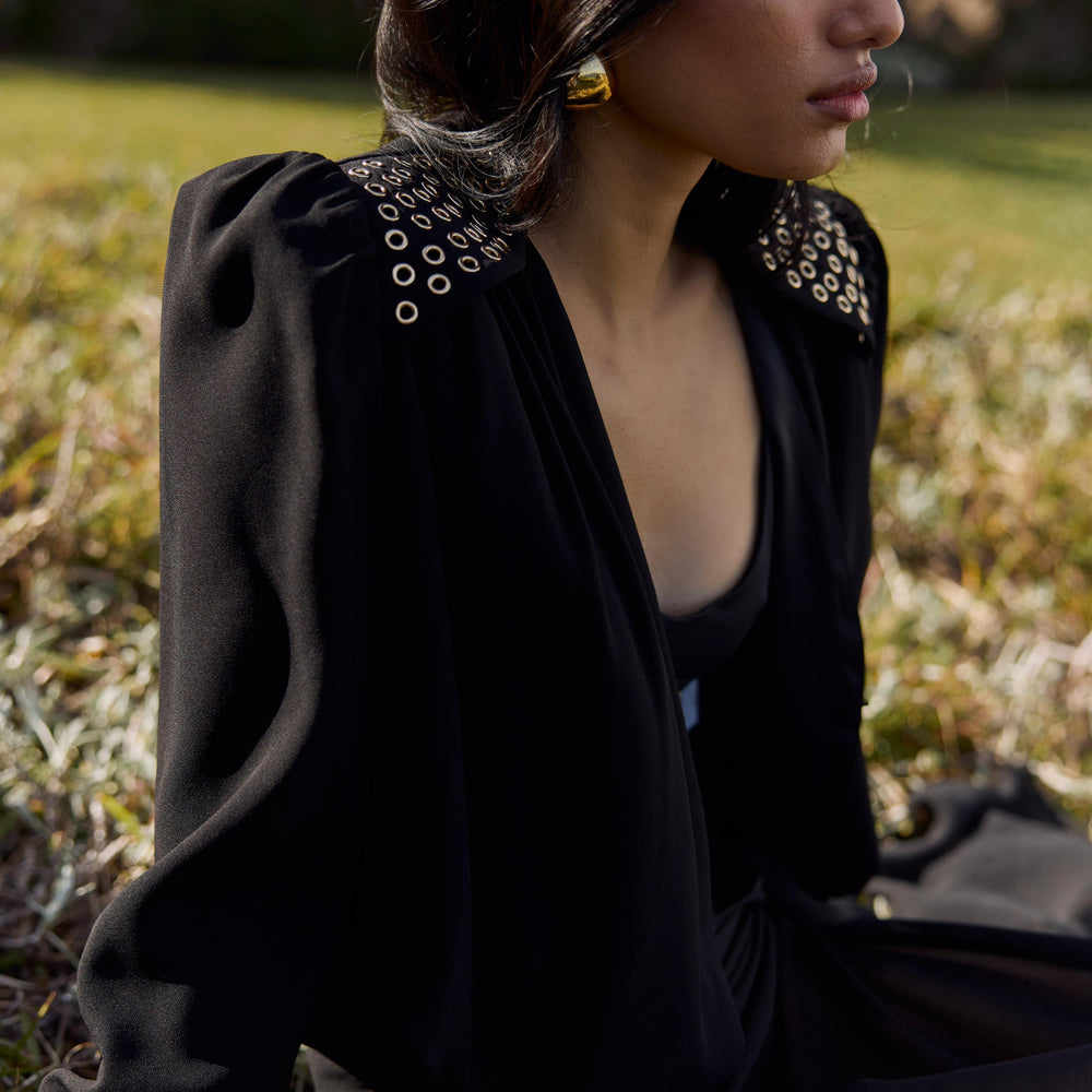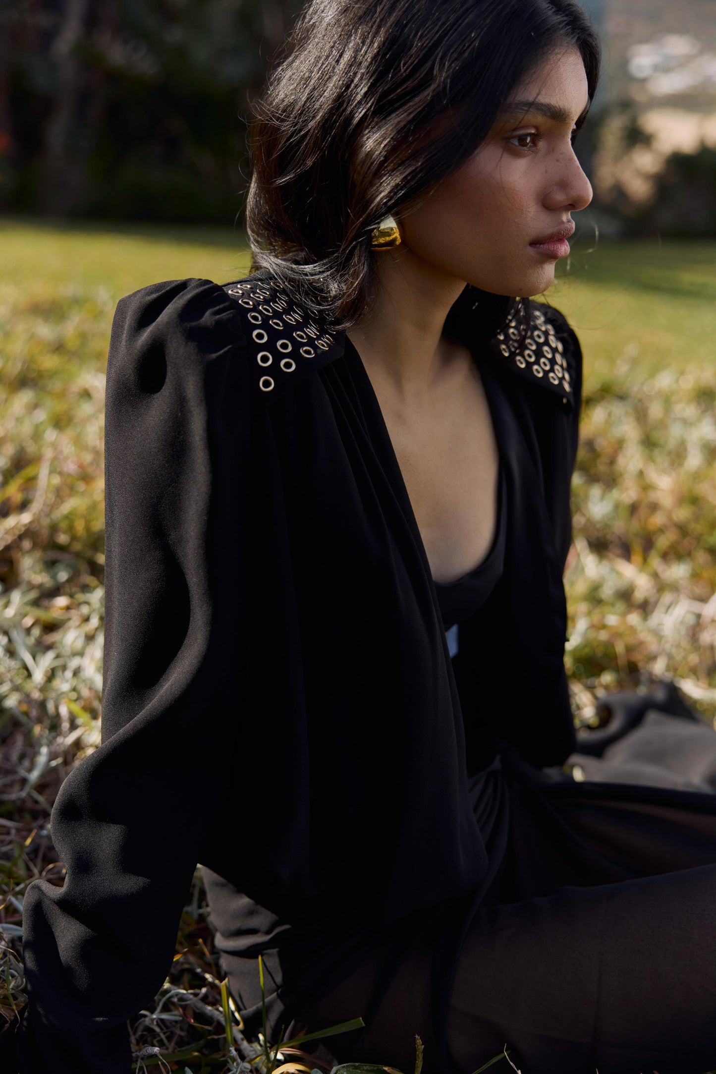 Structured yet feminine, the Charmi Jacket is defined by its softly gathered hem and sculptural sleeve silhouette. Crafted in a lustrous crepe with a subtle texture, it features gold eyelet detailing at the front shoulder panels, a softly gathered hemline, and a gold metal zip at the sleeve opening. Designed to be worn open, the Charmi Jacket layers effortlessly with tailored trousers or fluid dresses, bringing structure and softness to any look.