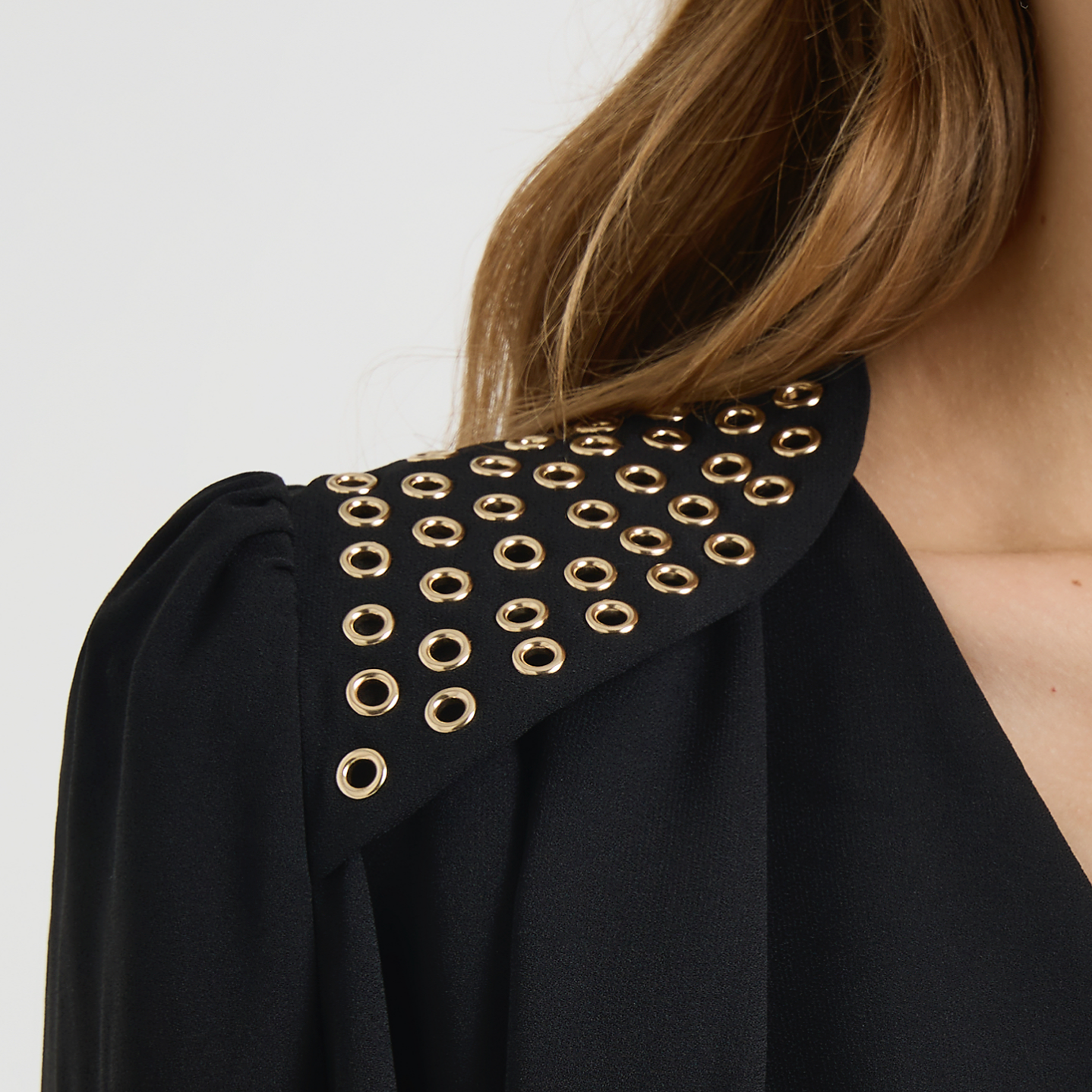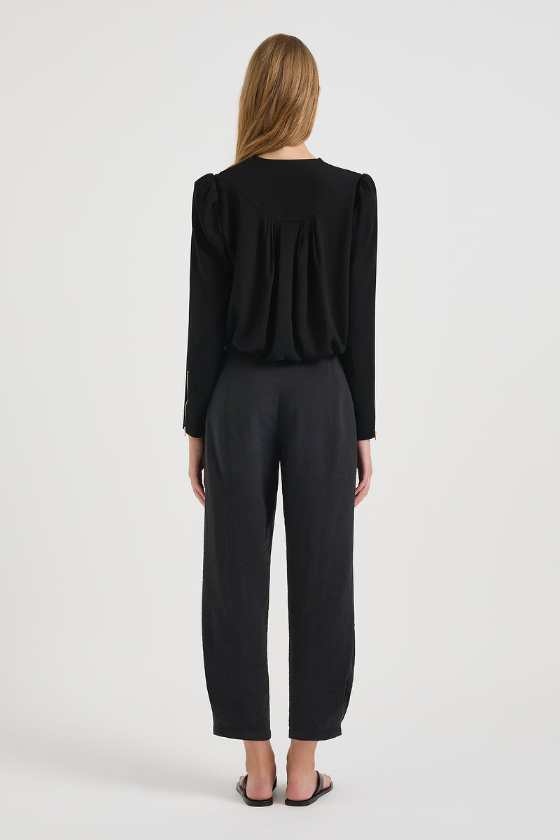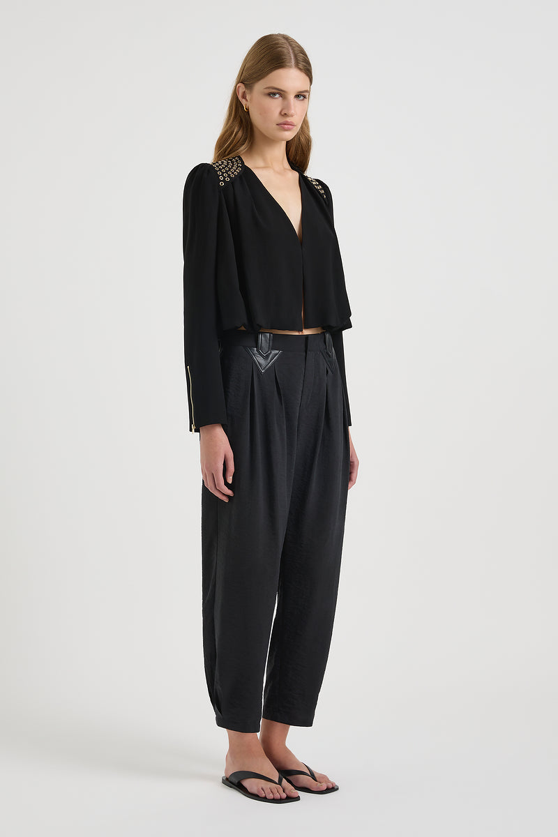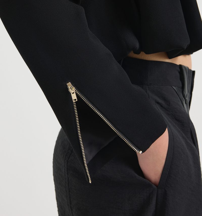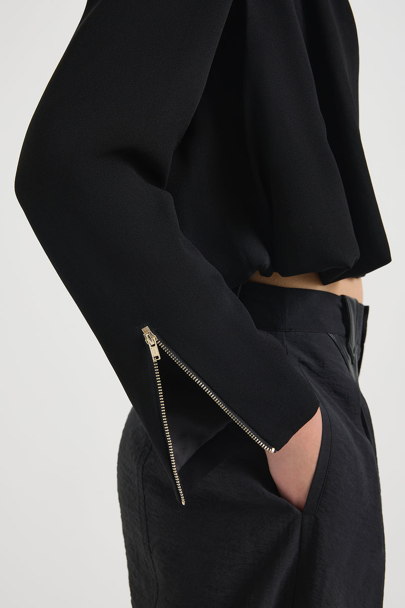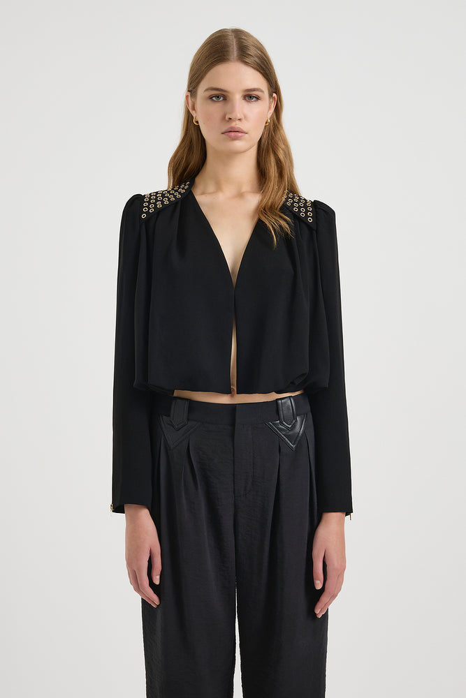 Structured yet feminine, the Charmi Jacket is defined by its softly gathered hem and sculptural sleeve silhouette. Crafted in a lustrous crepe with a subtle texture, it features gold eyelet detailing at the front shoulder panels, a softly gathered hemline, and a gold metal zip at the sleeve opening. Designed to be worn open, the Charmi Jacket layers effortlessly with tailored trousers or fluid dresses, bringing structure and softness to any look.