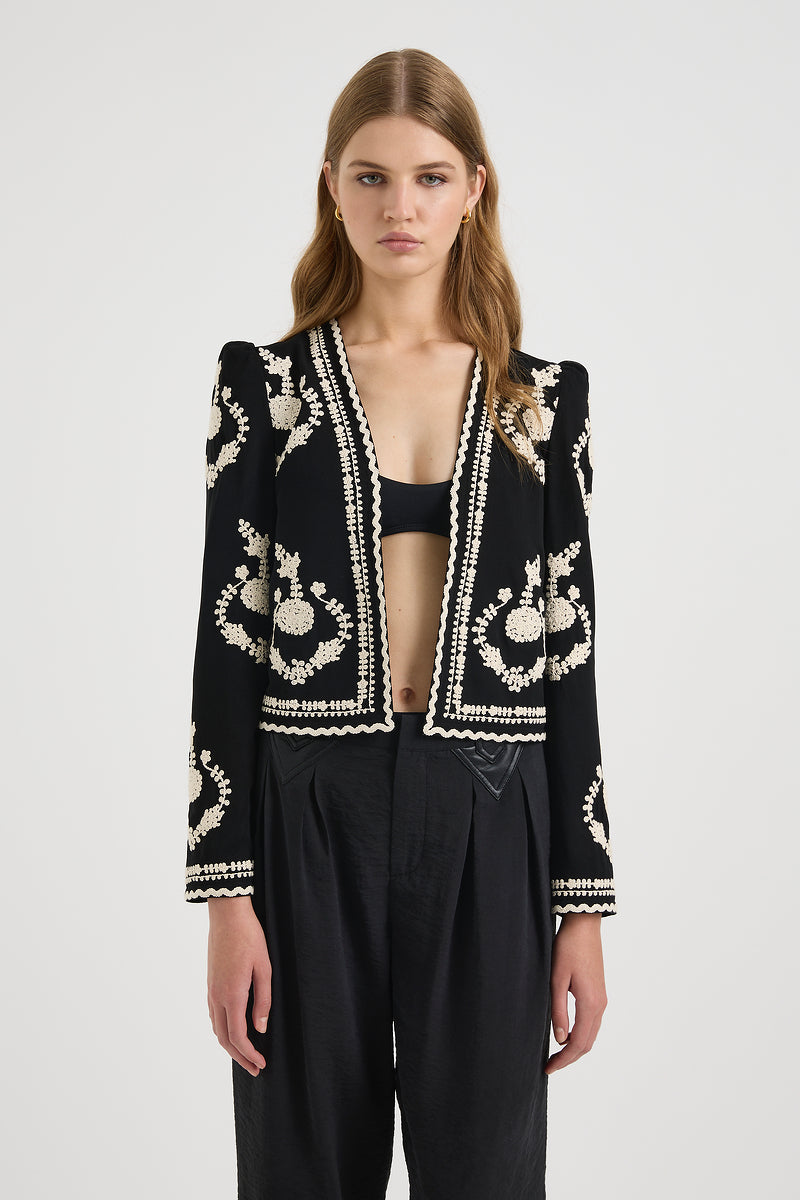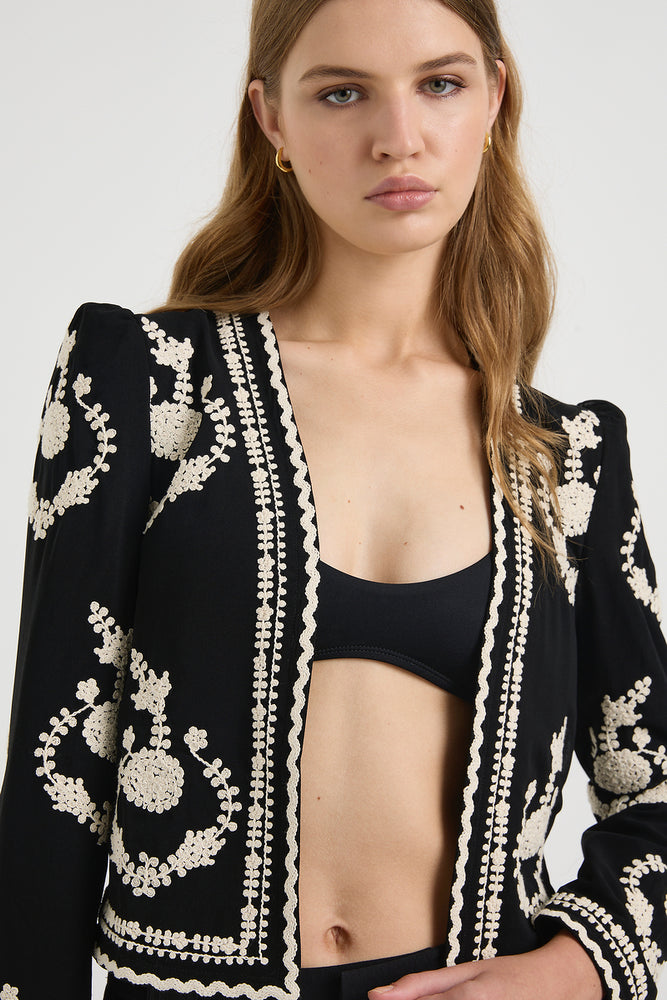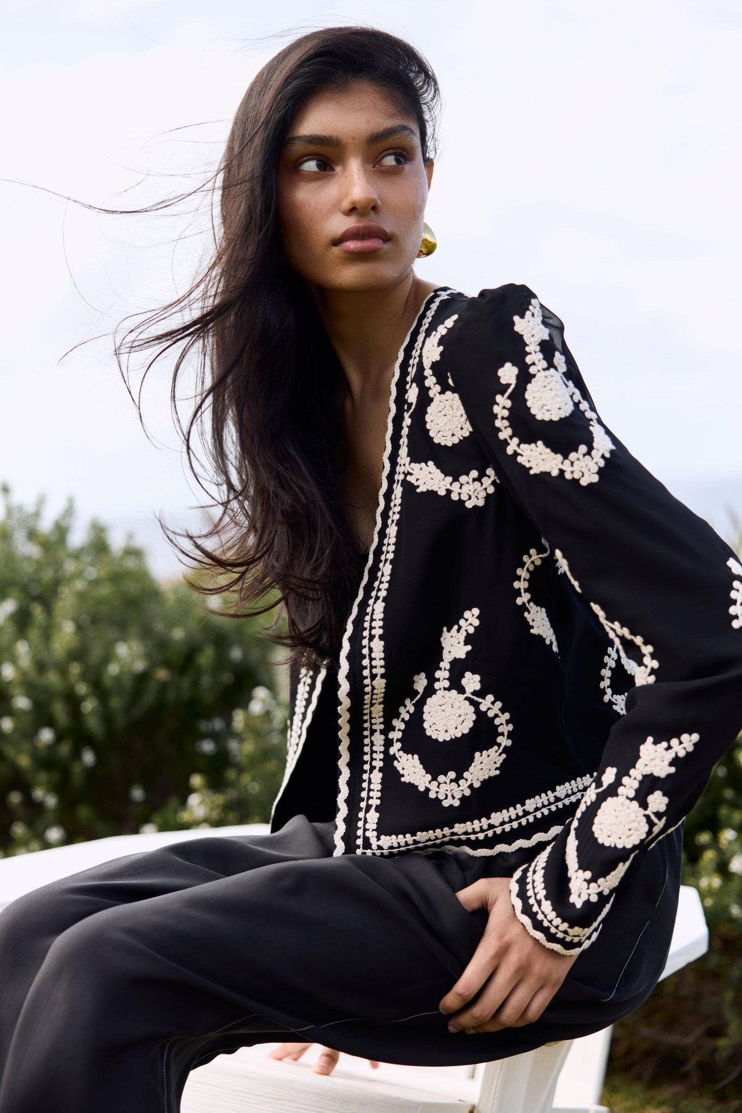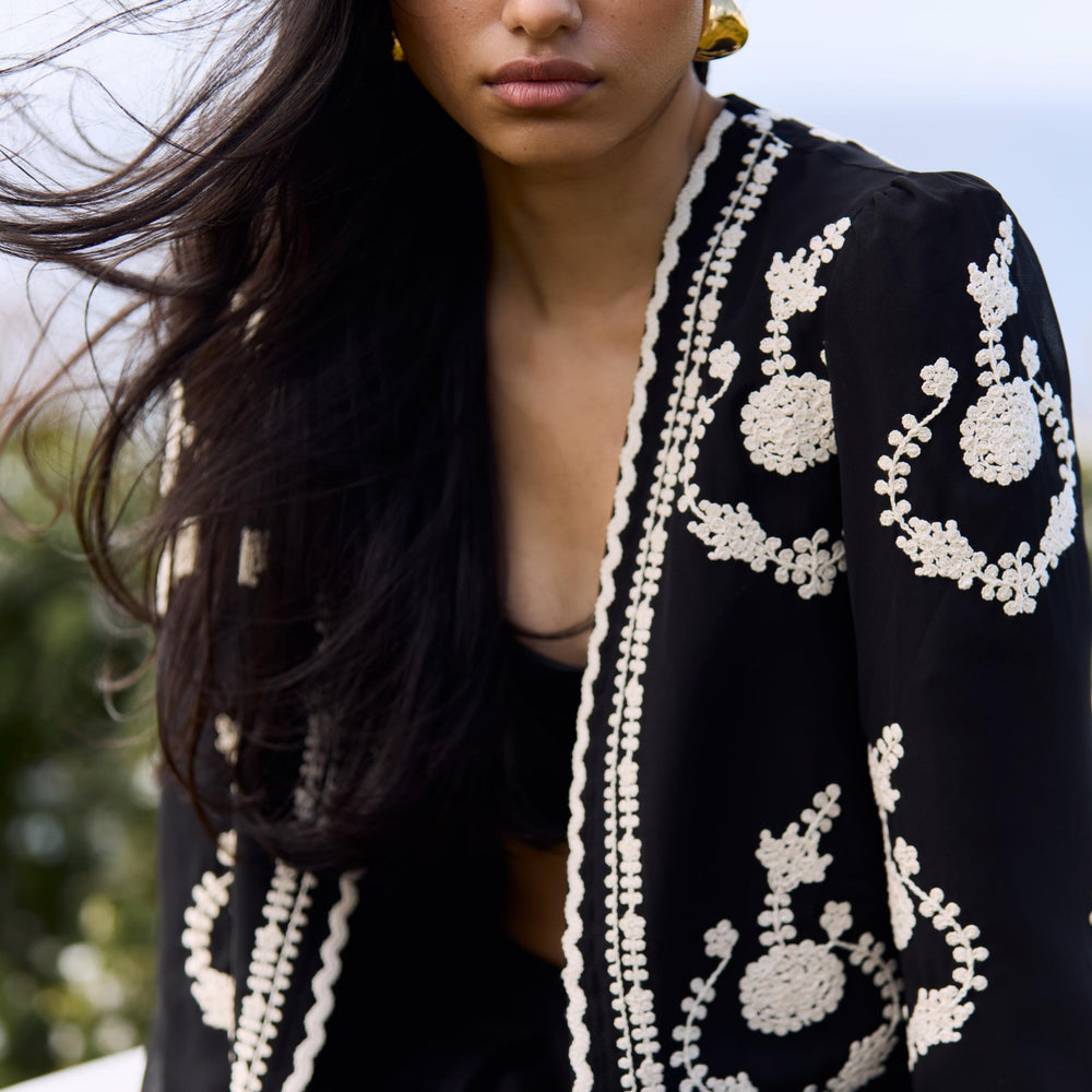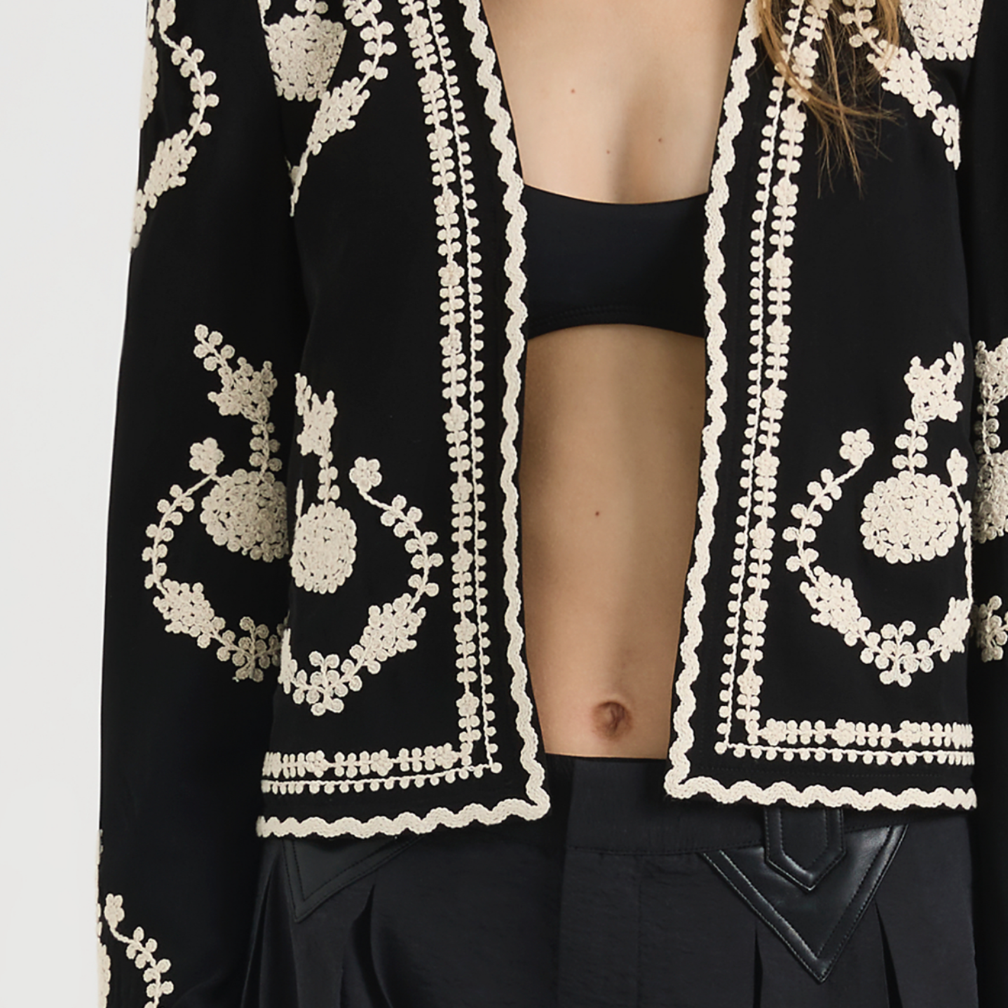 Without saying a word, this garment tells a story. Being a true statement piece, the Selva Embroidery Jacket embodies a world of artisanal detail. The delicately tailored silhouette offers a flattering straight fit, with a slightly cropped length and a softly shaped hemline finished with a cotton rope embroidery pattern, this jacket is designed to elevate even the simplest outfit.