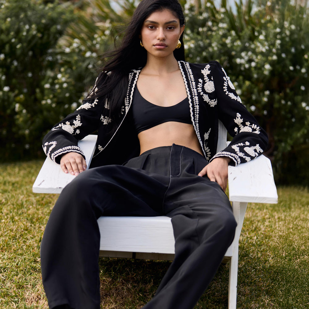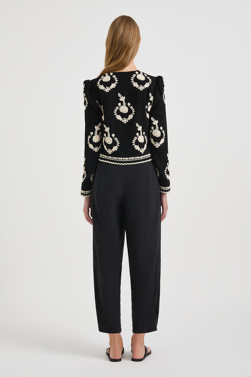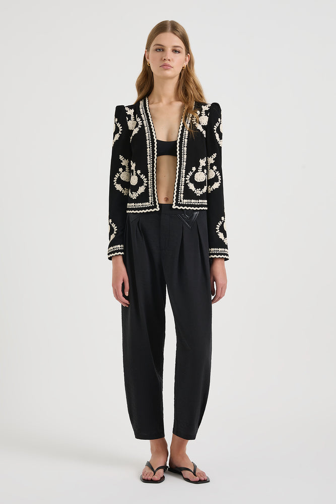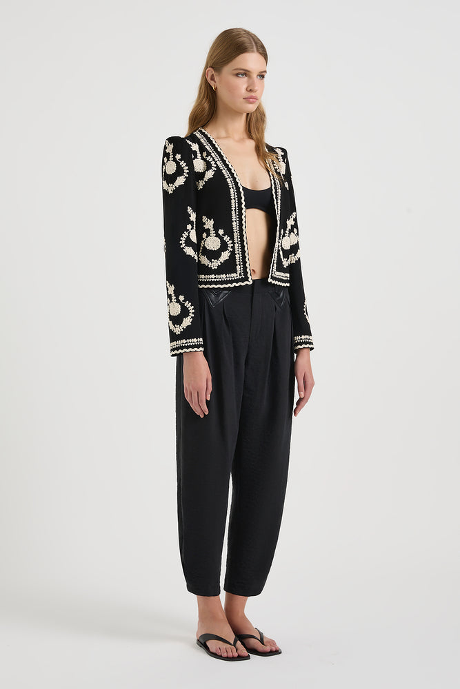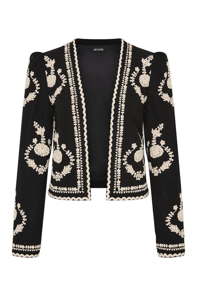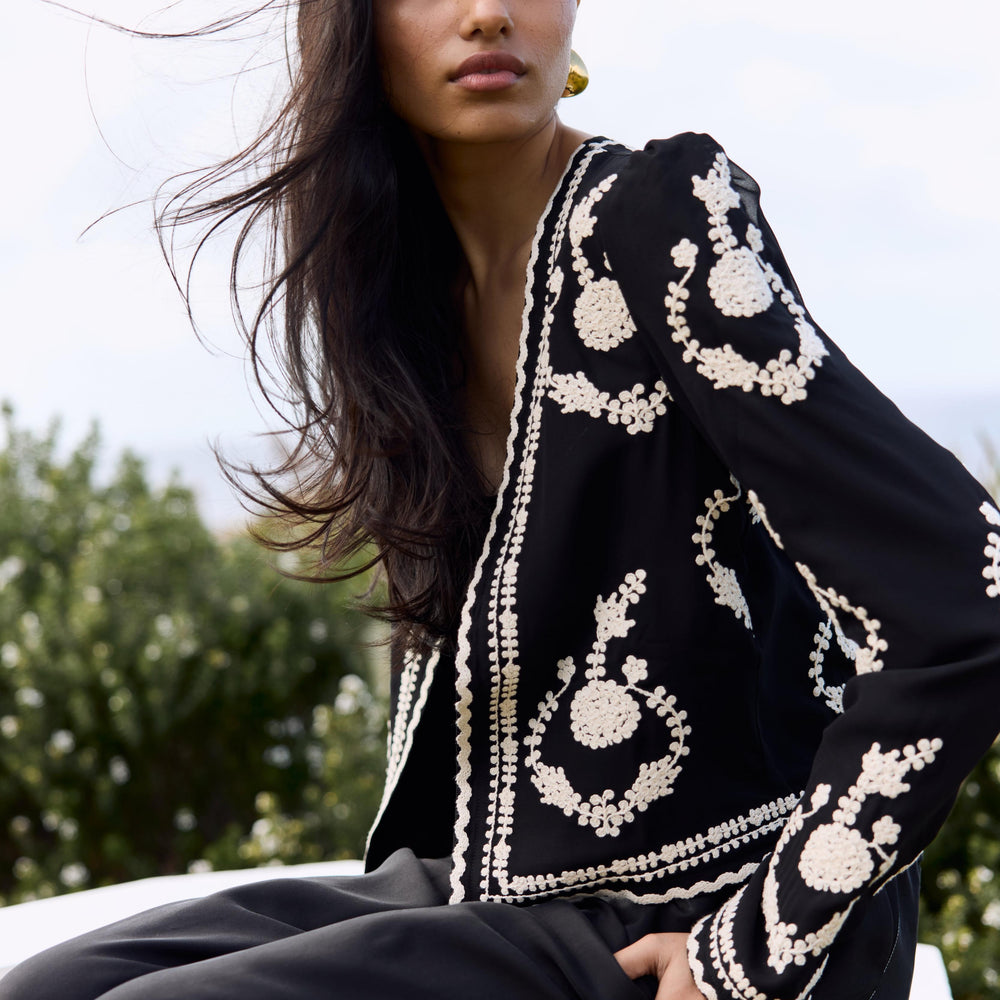 Without saying a word, this garment tells a story. Being a true statement piece, the Selva Embroidery Jacket embodies a world of artisanal detail. The delicately tailored silhouette offers a flattering straight fit, with a slightly cropped length and a softly shaped hemline finished with a cotton rope embroidery pattern, this jacket is designed to elevate even the simplest outfit.